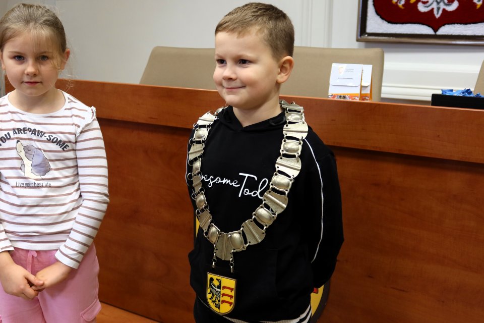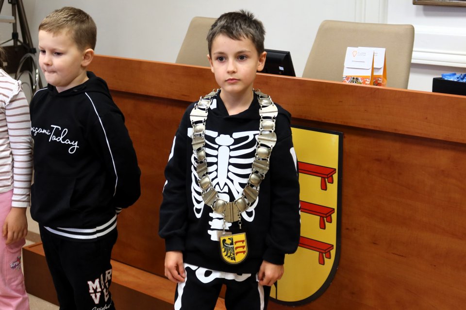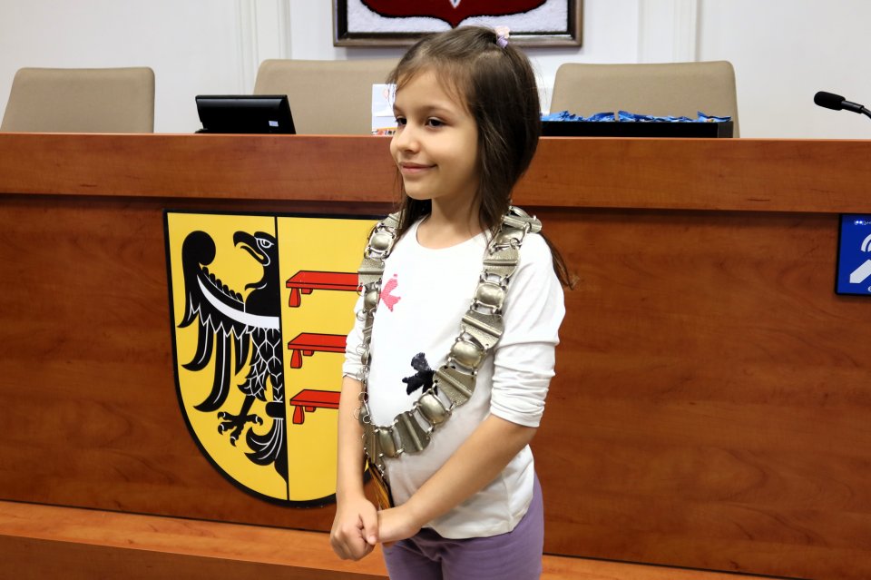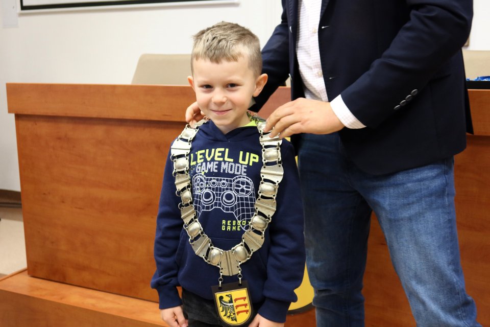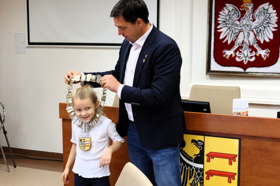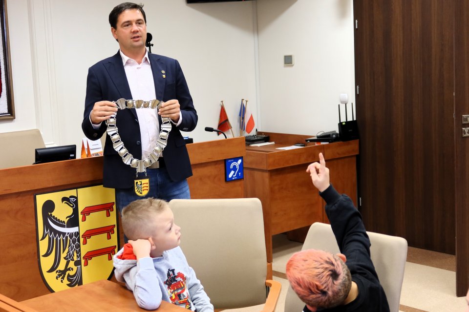 Jednym z punktów programu była wizyta w sali posiedzeń. Na uczniów czekał tam Przewodniczący Rady Miejskiej w Piławie Górnej Dariusz Madejski, który opowiedział im jak wygląda praca radnych. Dzieci mogły nawet przymierzyć łańcuch przewodniczącego Rady, co wywołało wiele radości.
