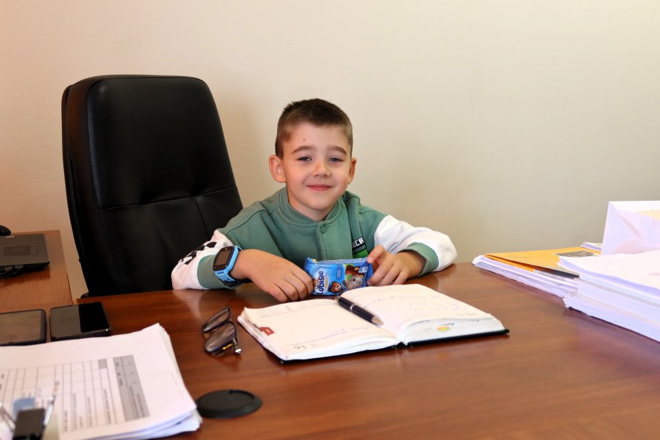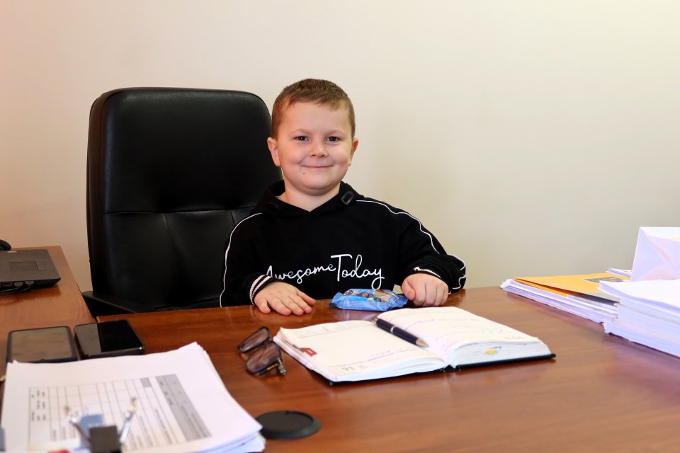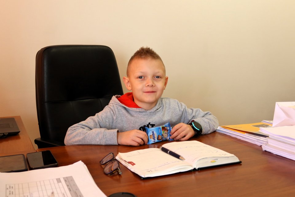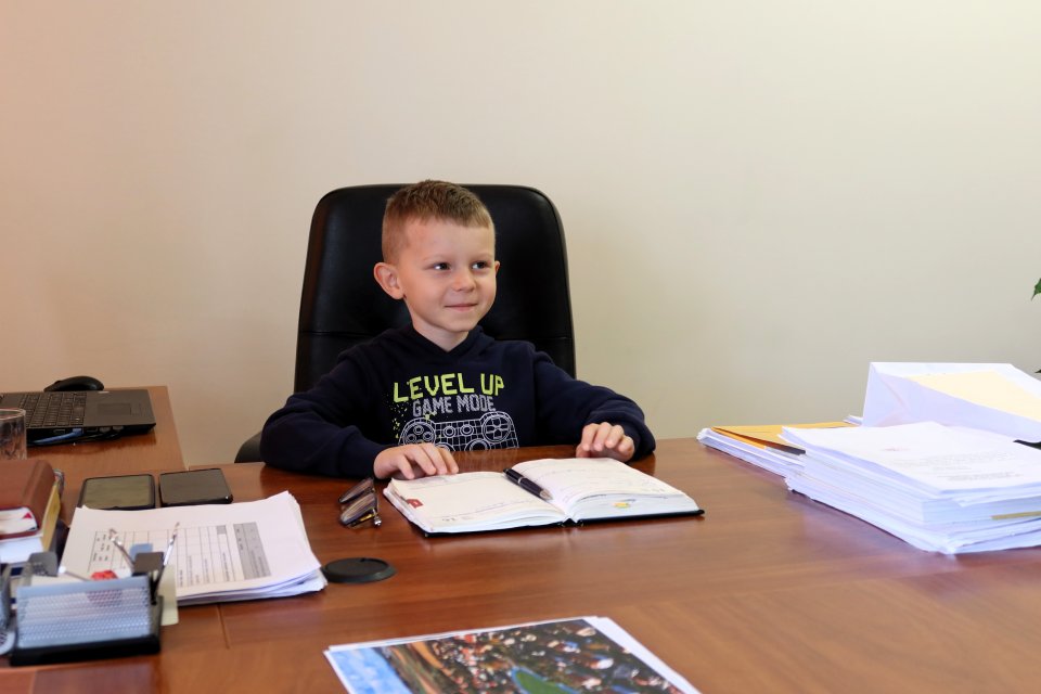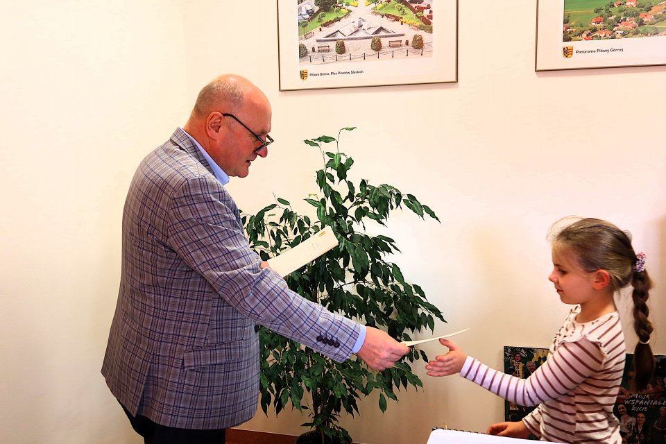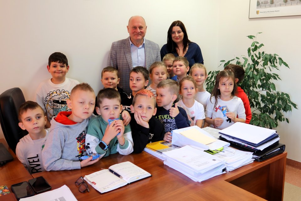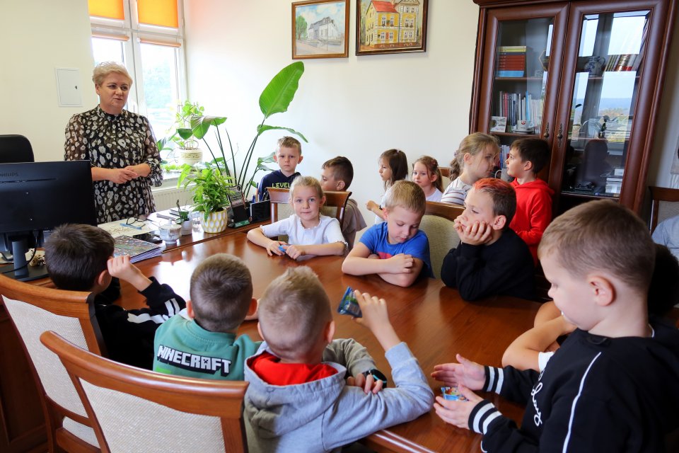 Następnie uczniowie odwiedzili gabinet burmistrza Piławy Górnej Krzysztofa Chudyka. Każdy mógł zasiąść na chwilę w fotelu burmistrza i zrobić sobie pamiątkowe zdjęcie. Podczas wizyty dzieci spotkały się także z zastępcą burmistrza Martą Sochacką-Pelczar oraz skarbnik gminy Martą Brzuszkiewicz, które przybliżyły im swoją codzienną pracę i znaczenie finansów w funkcjonowaniu miasta.